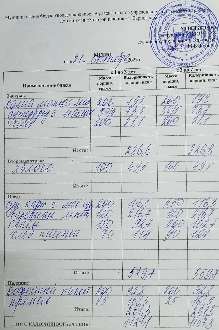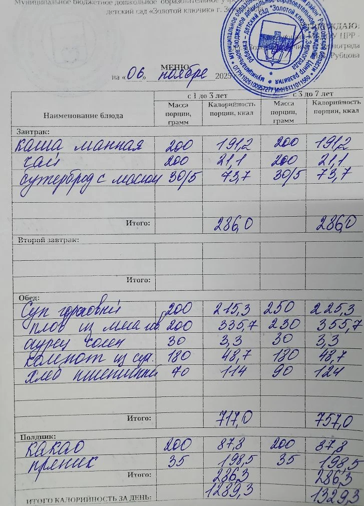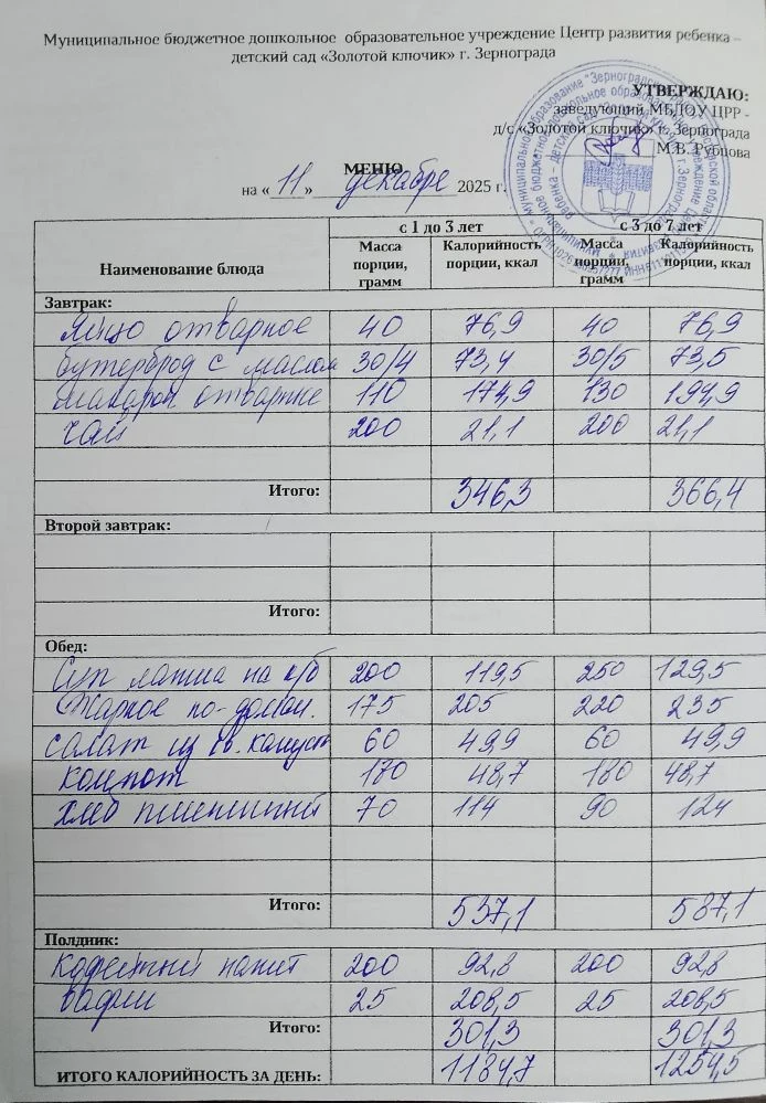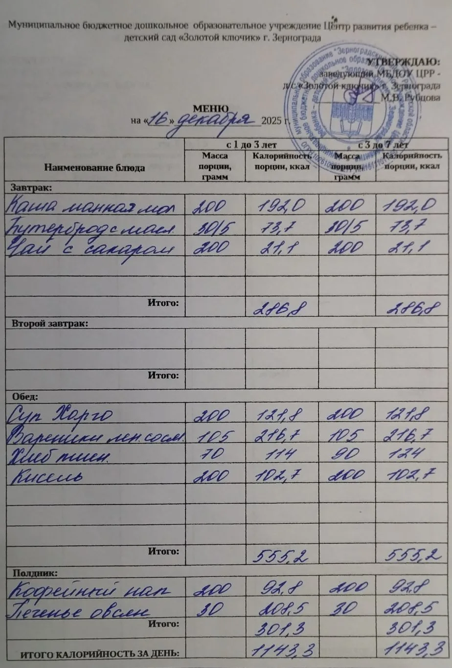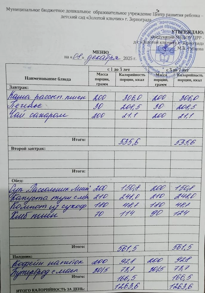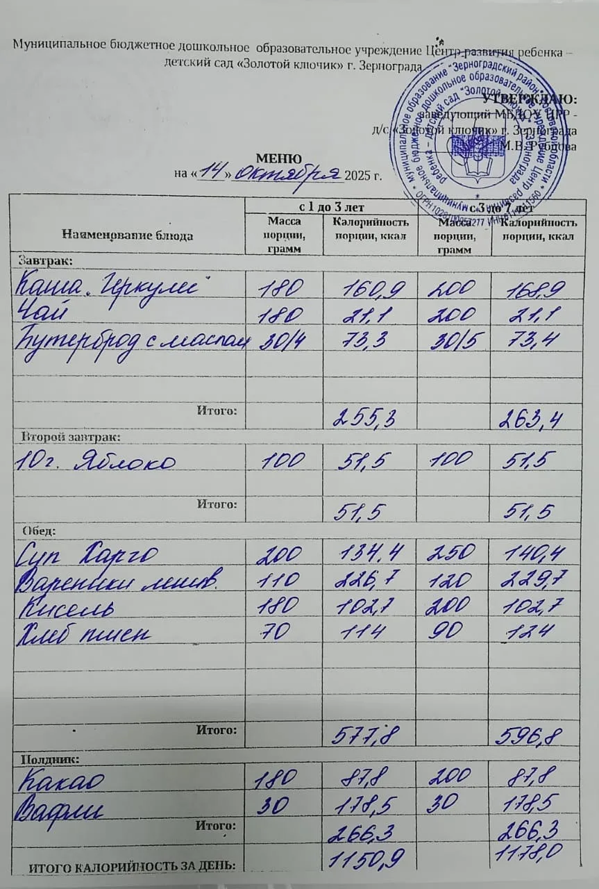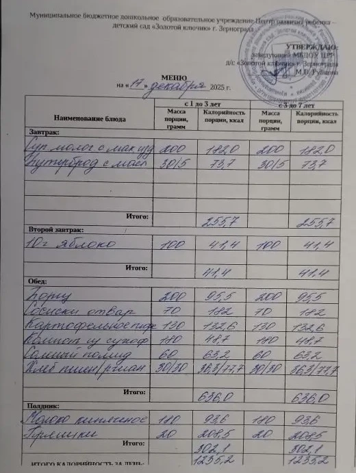 Меню ежедневного горячего питания