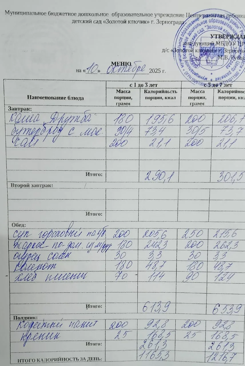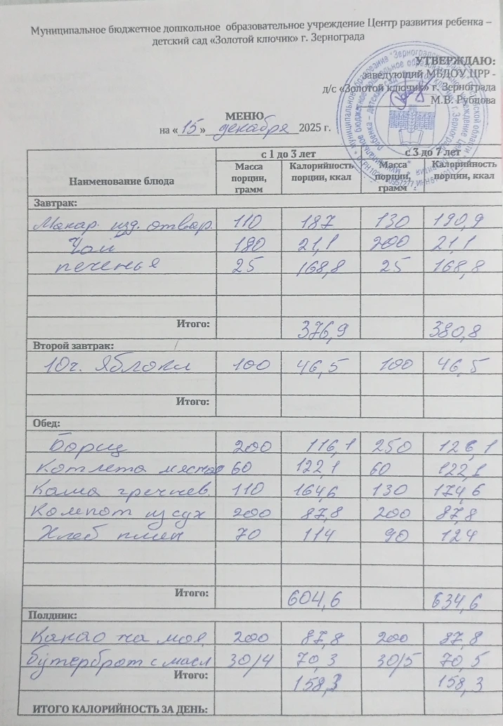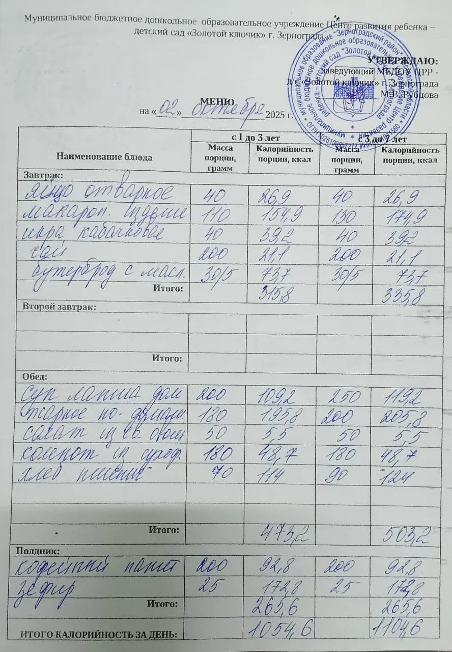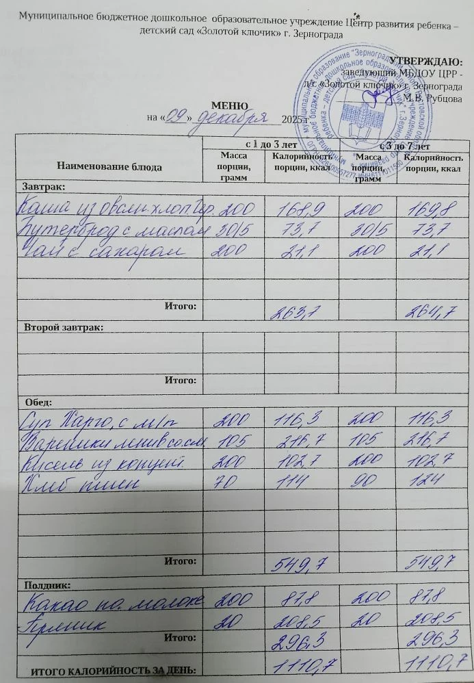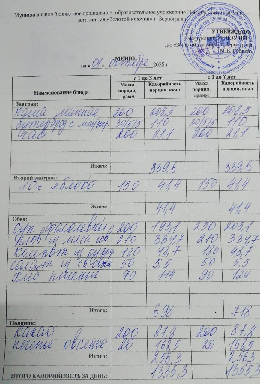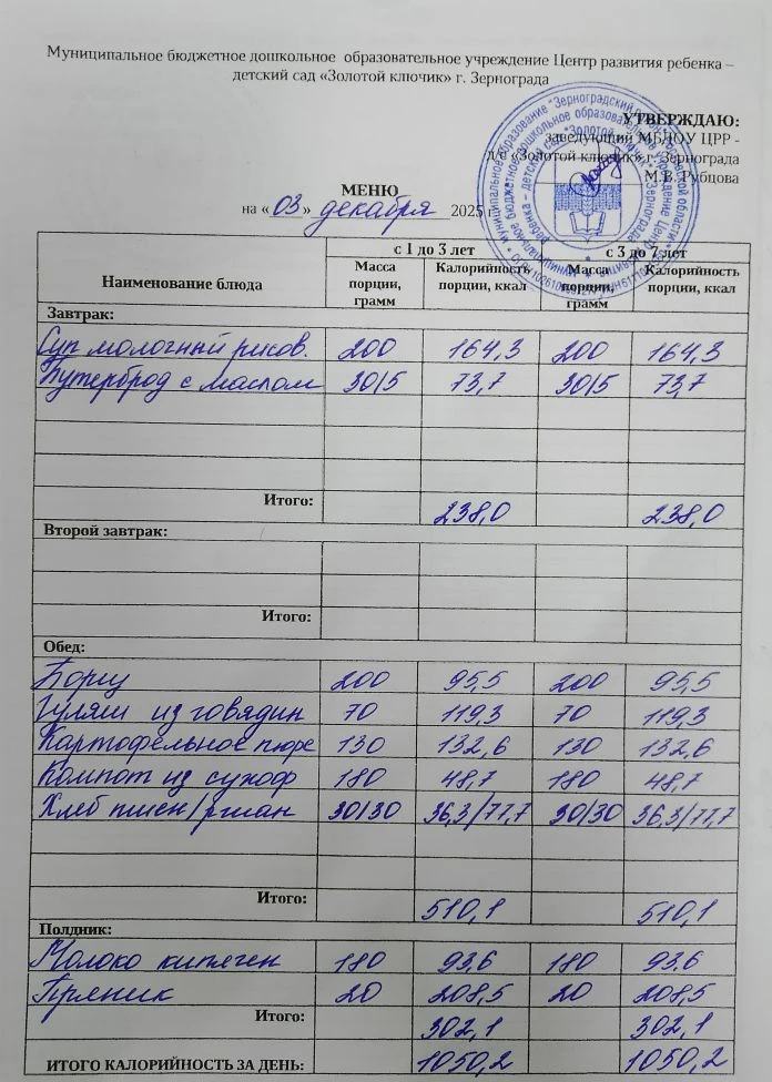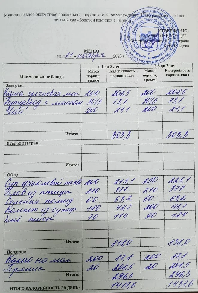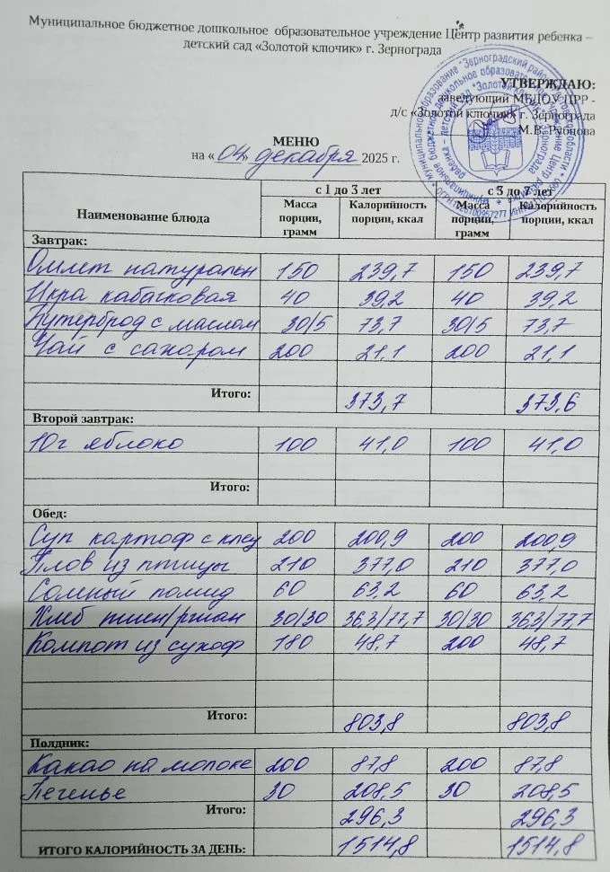 Меню ежедневного горячего питания