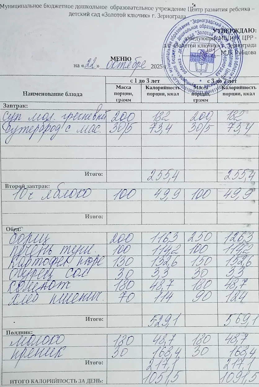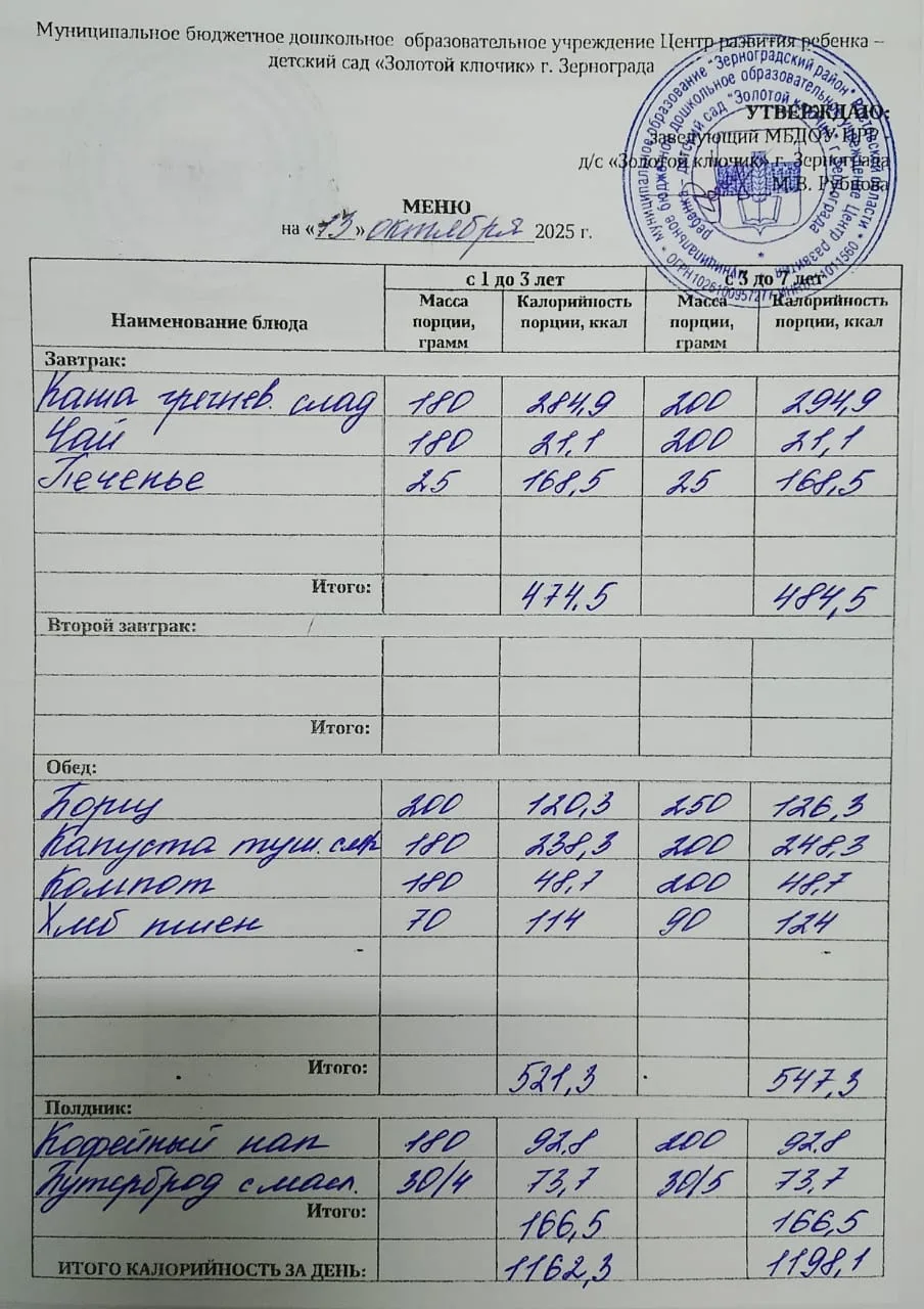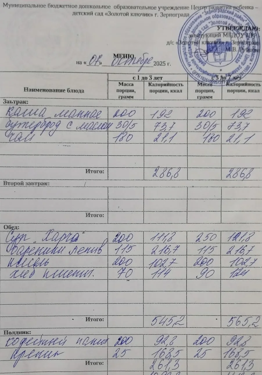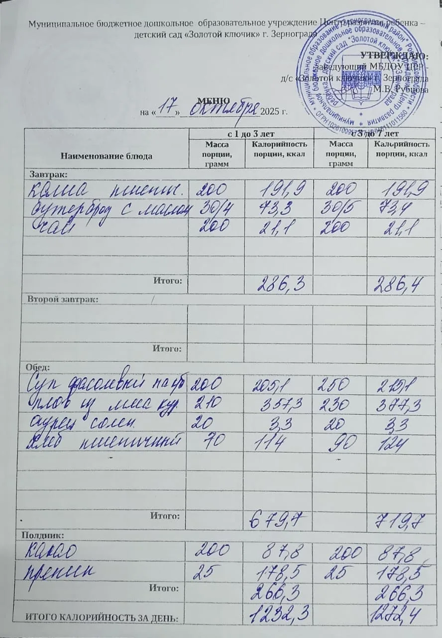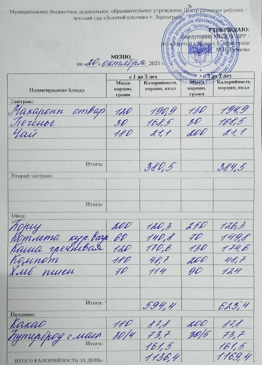Меню ежедневного горячего питания
