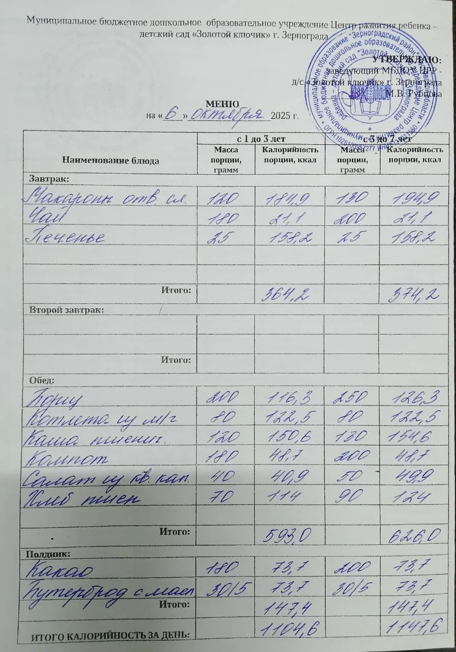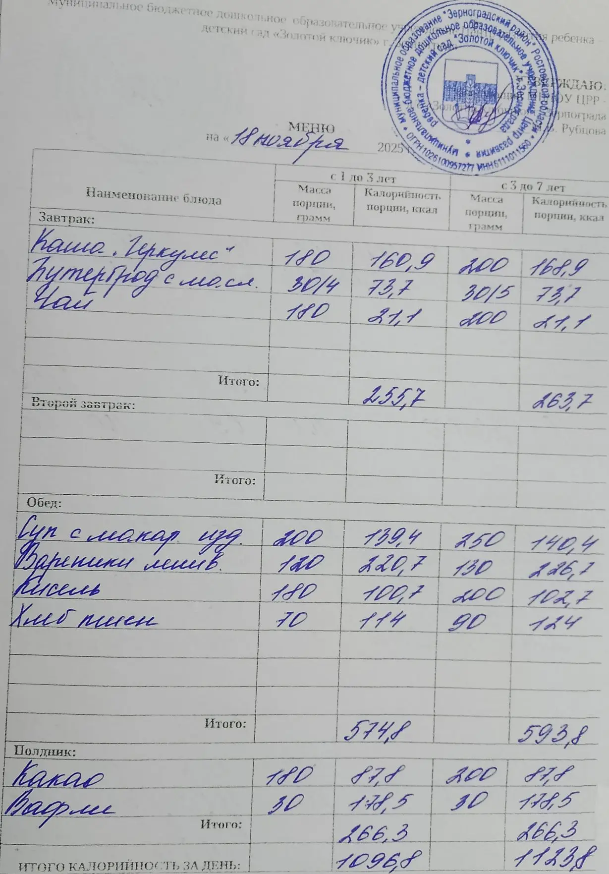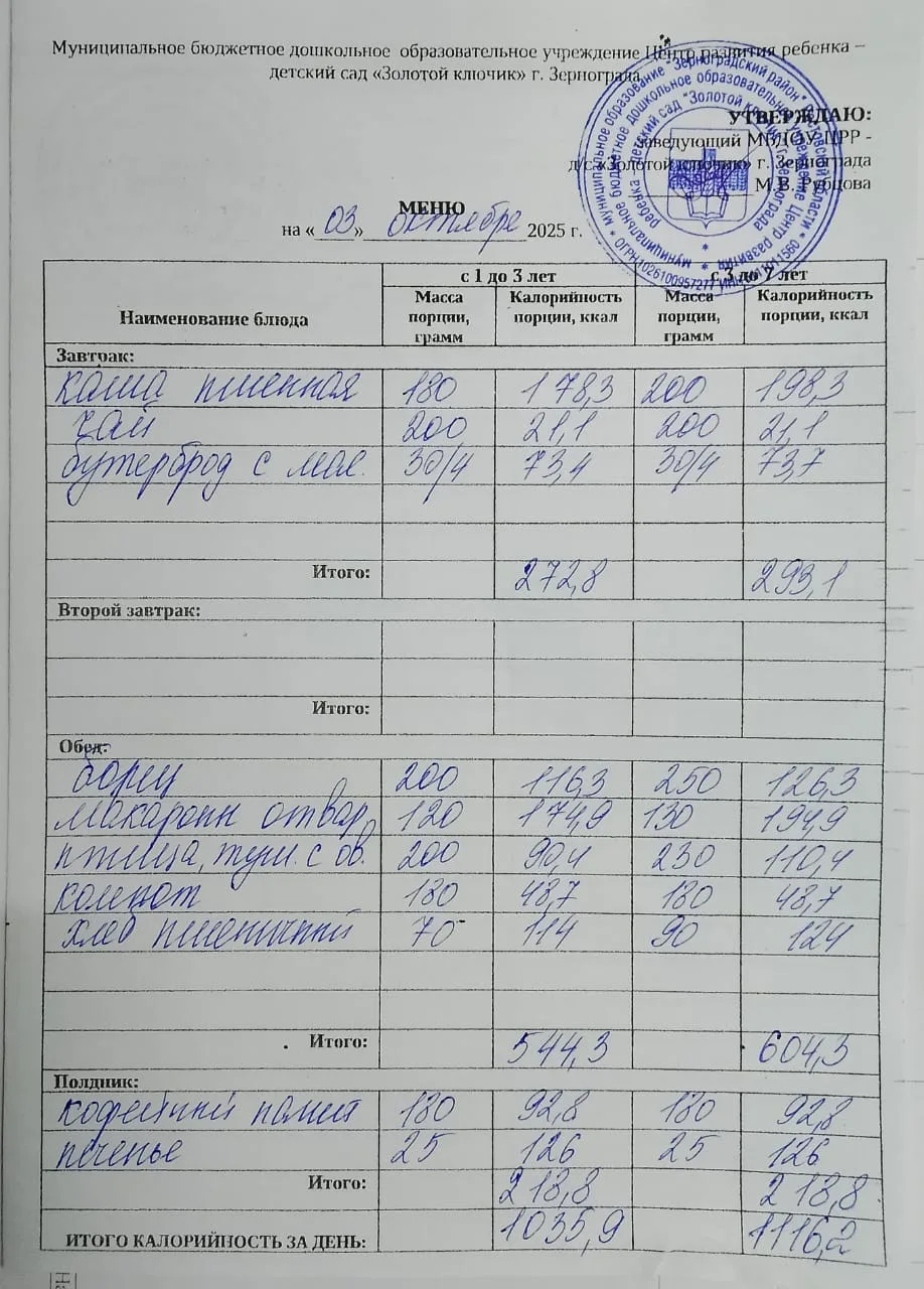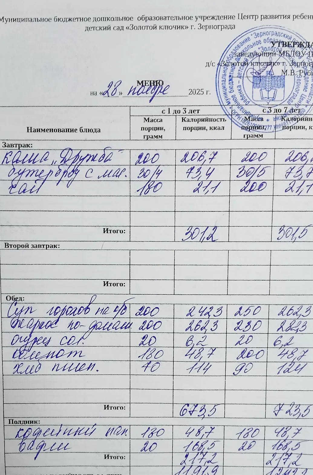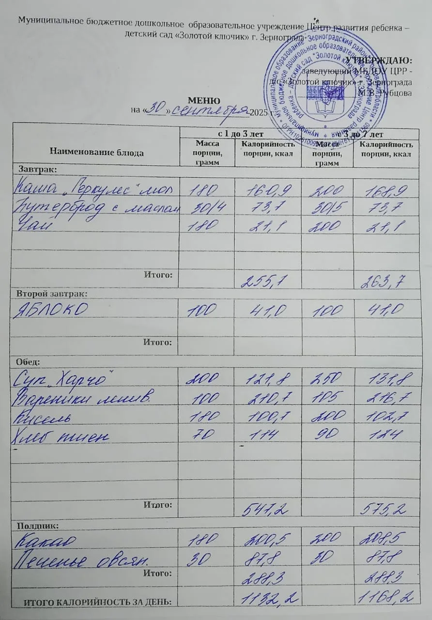 Меню ежедневного горячего питания