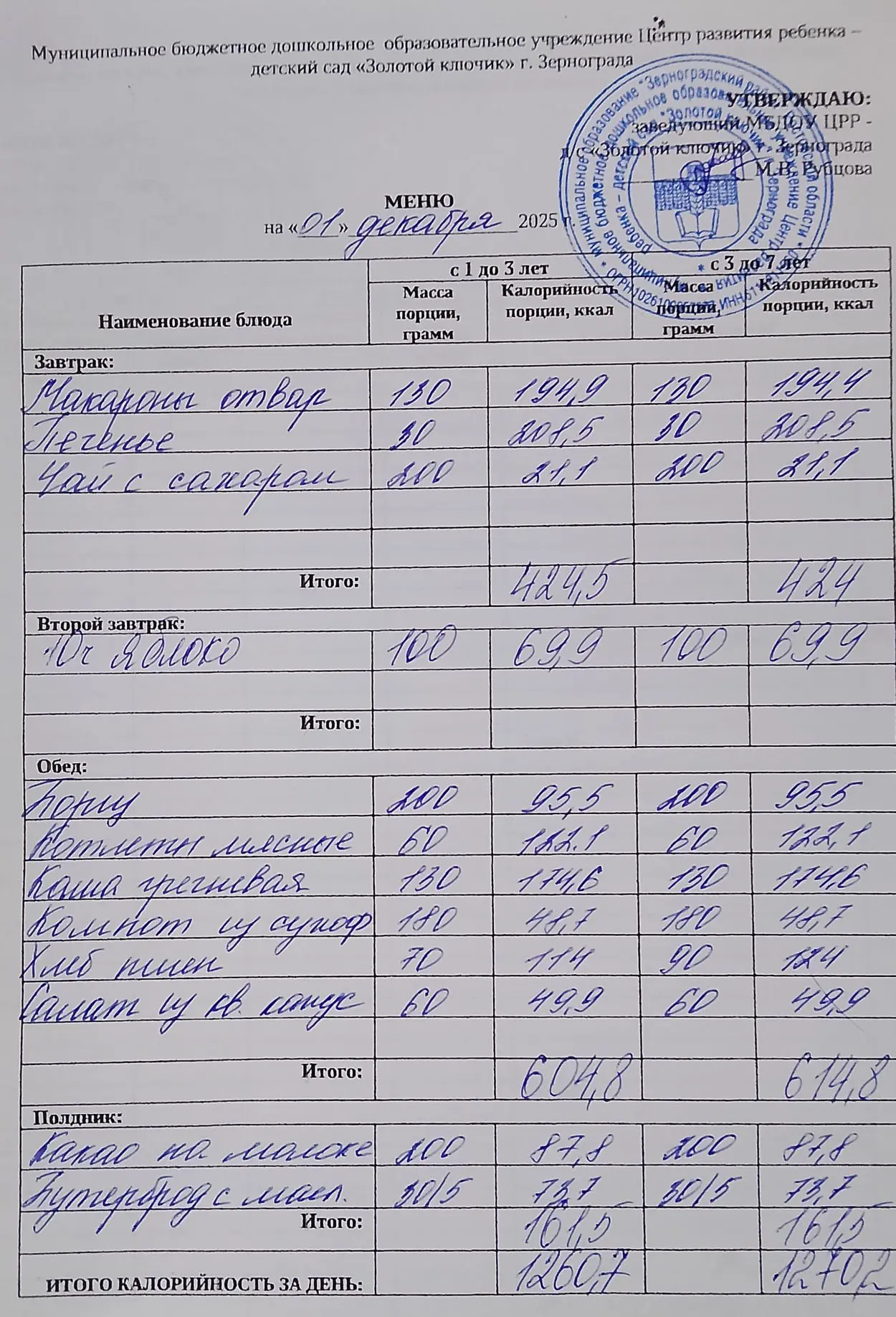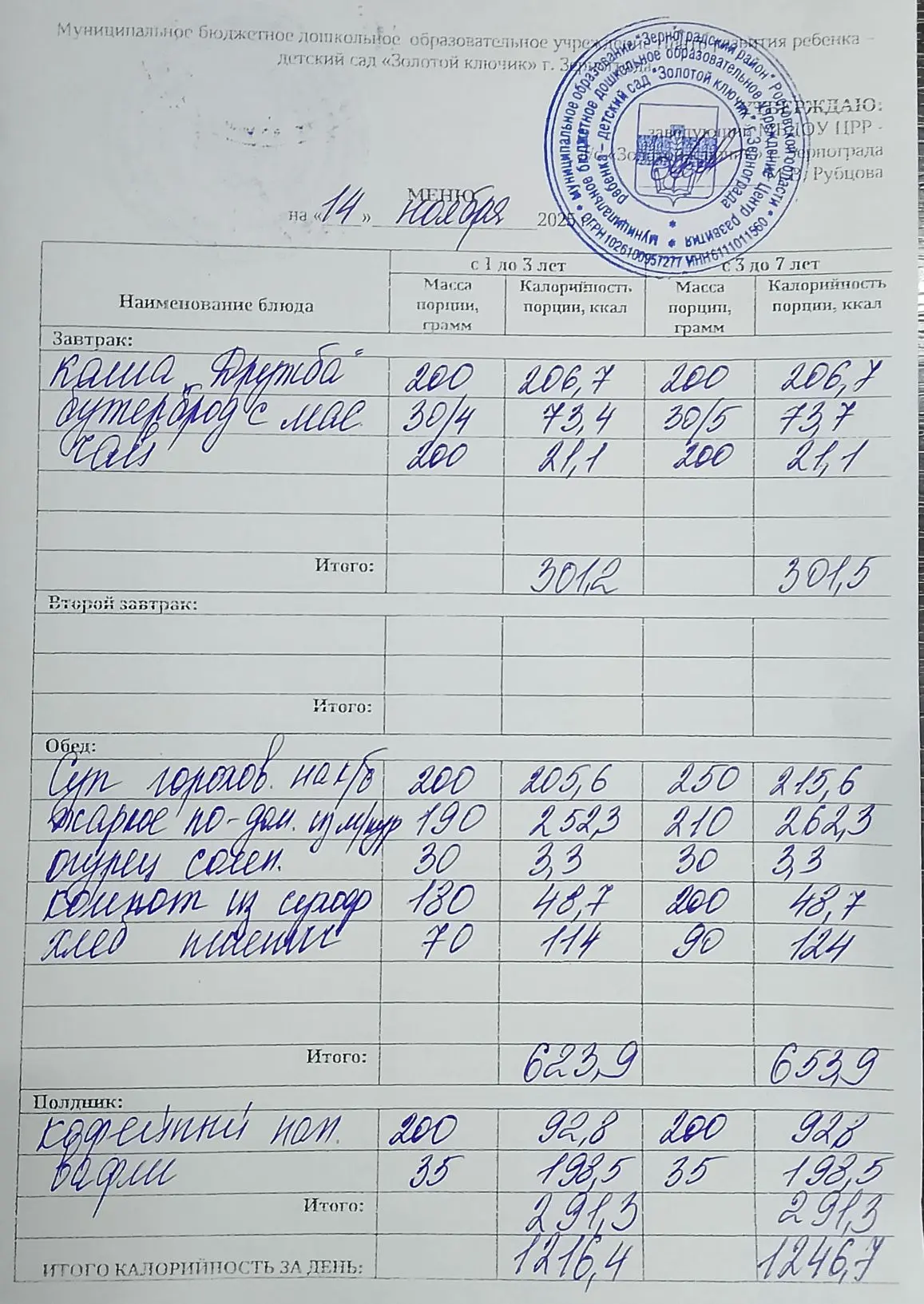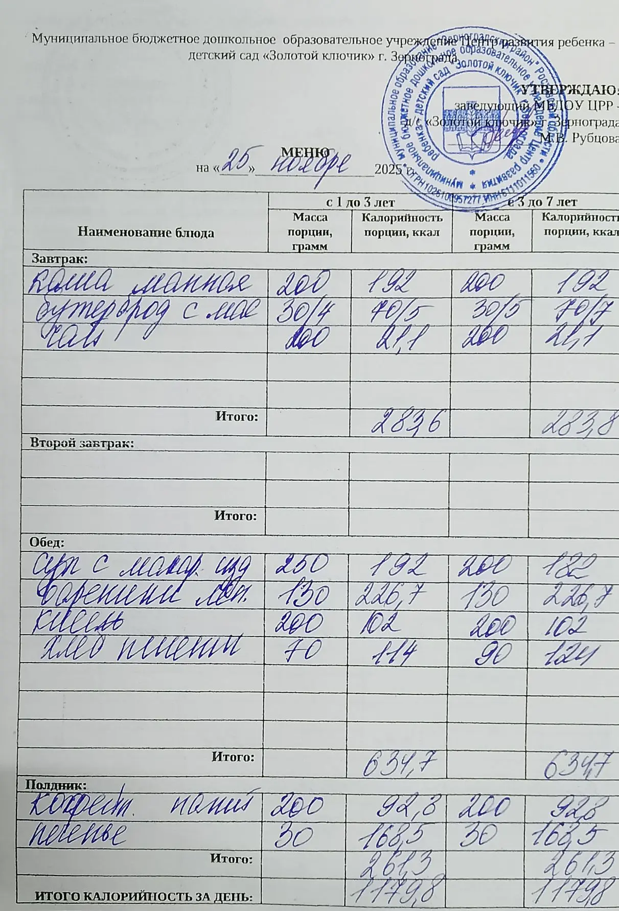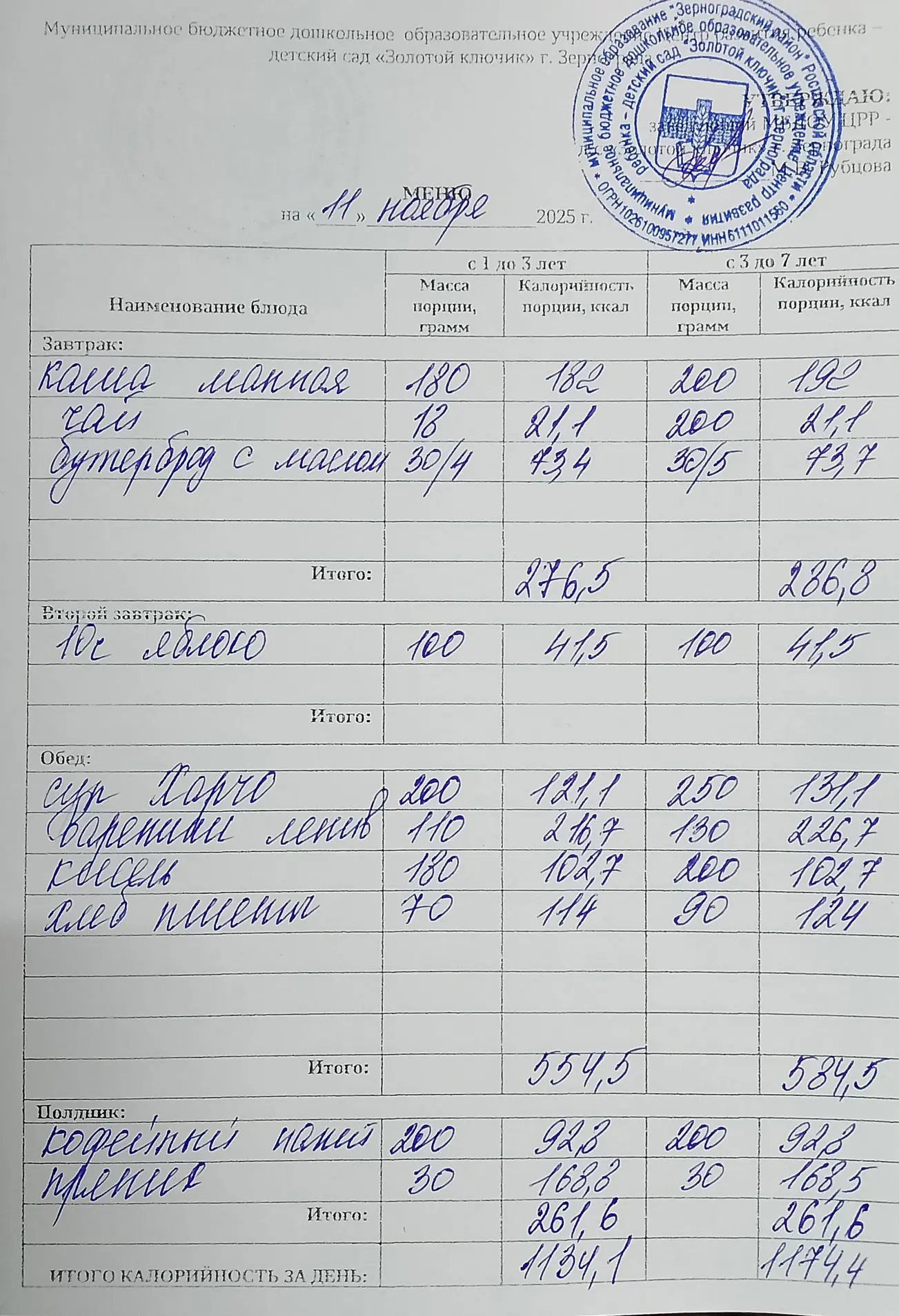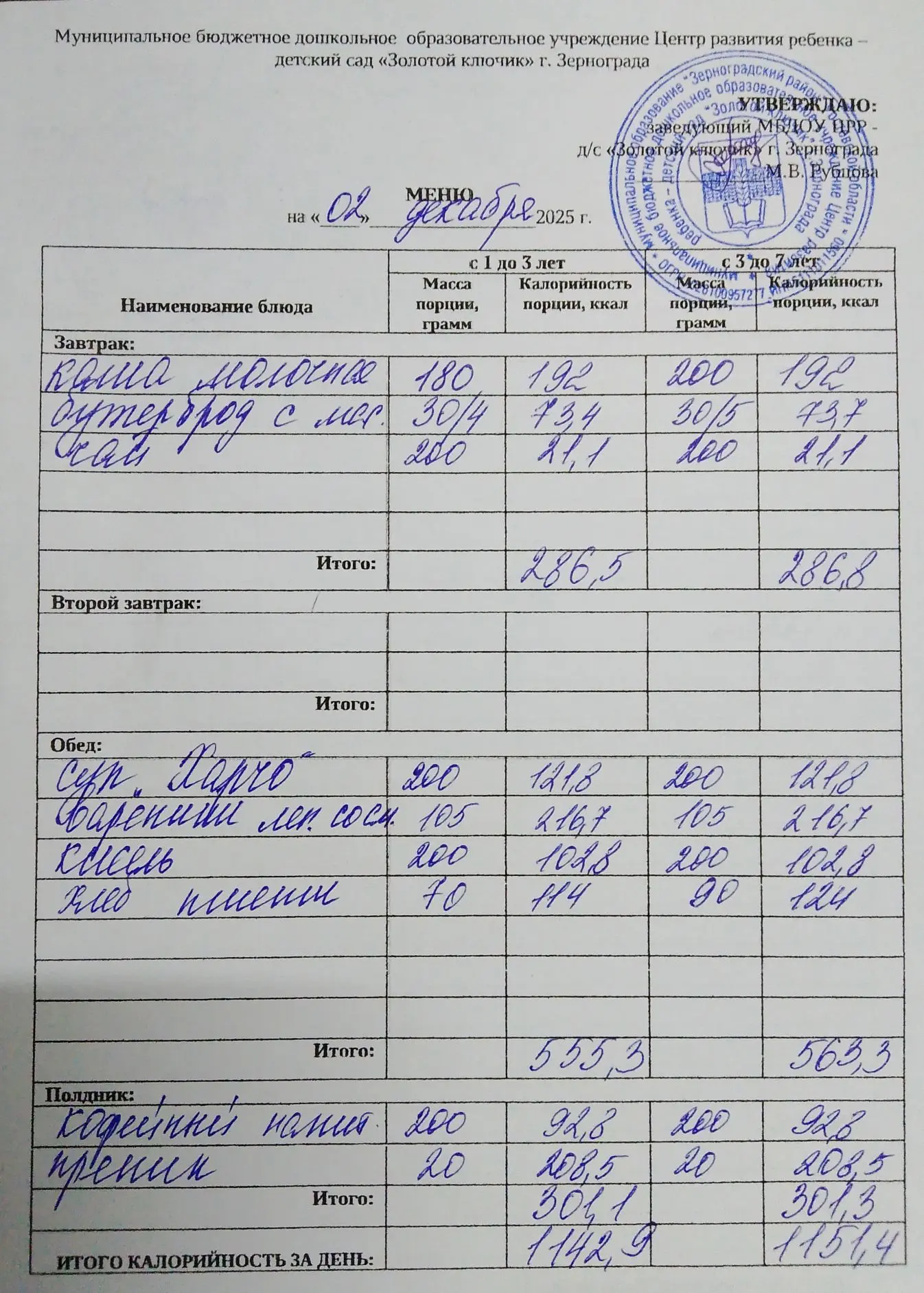 Меню ежедневного горячего питания