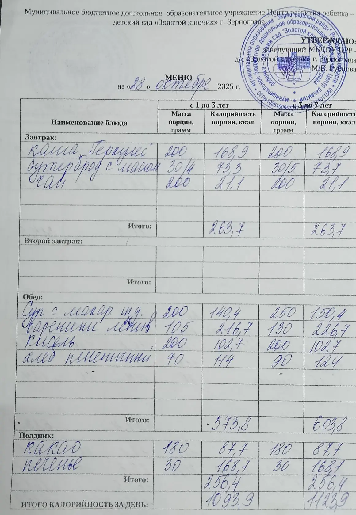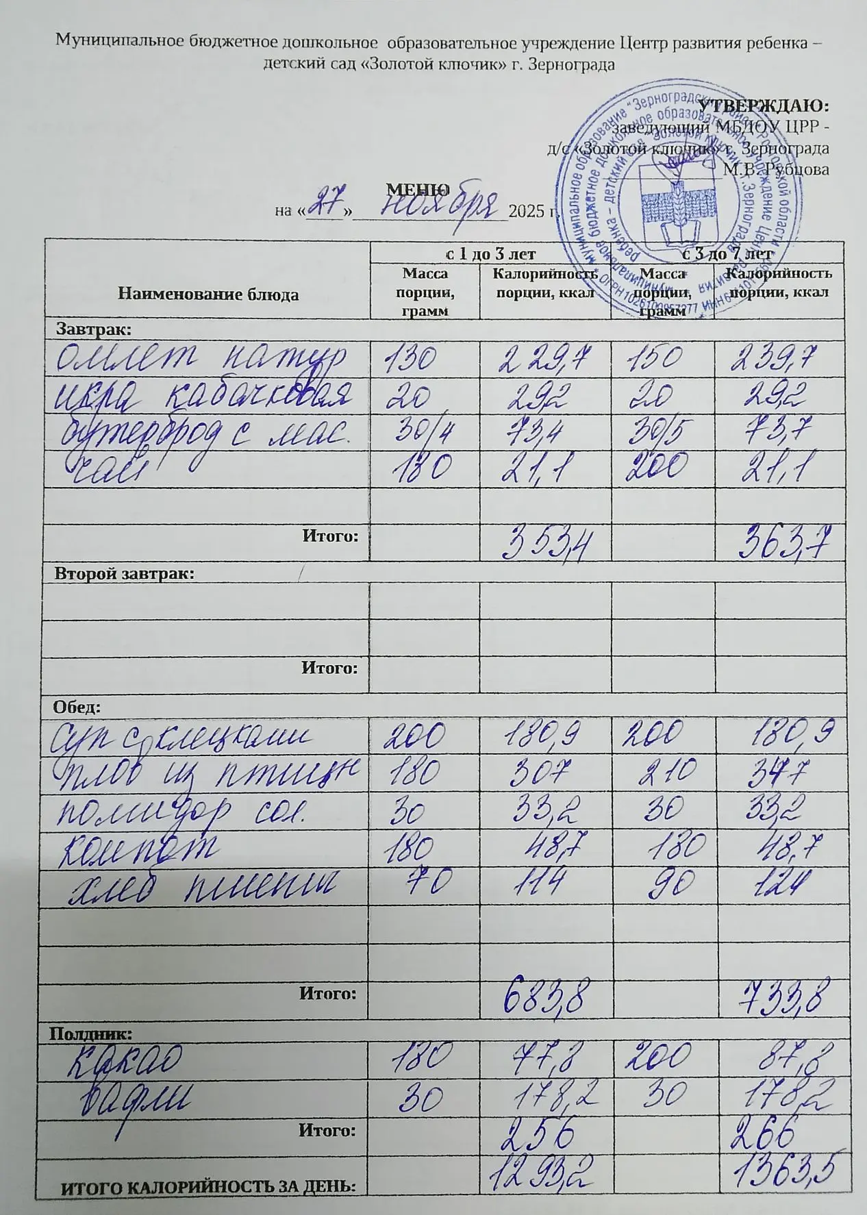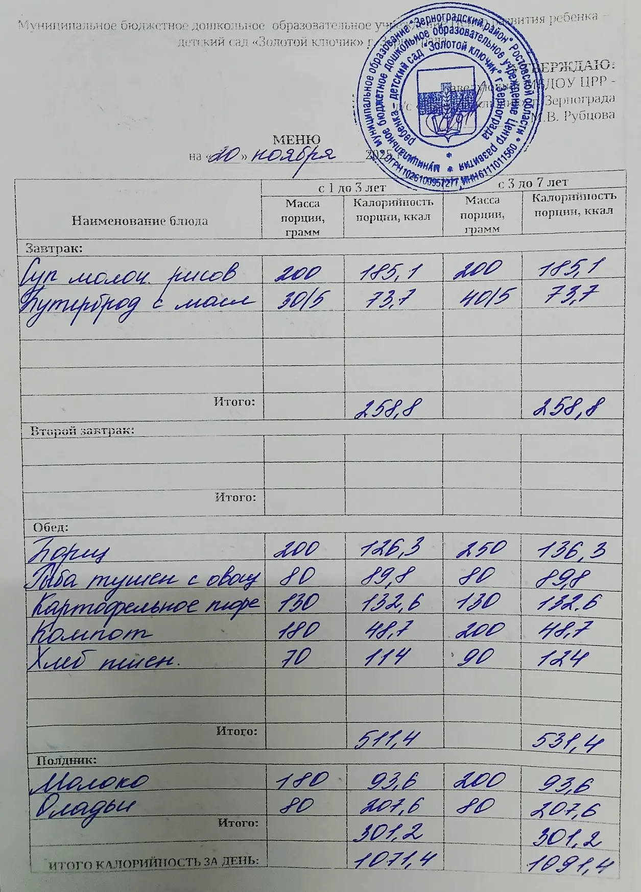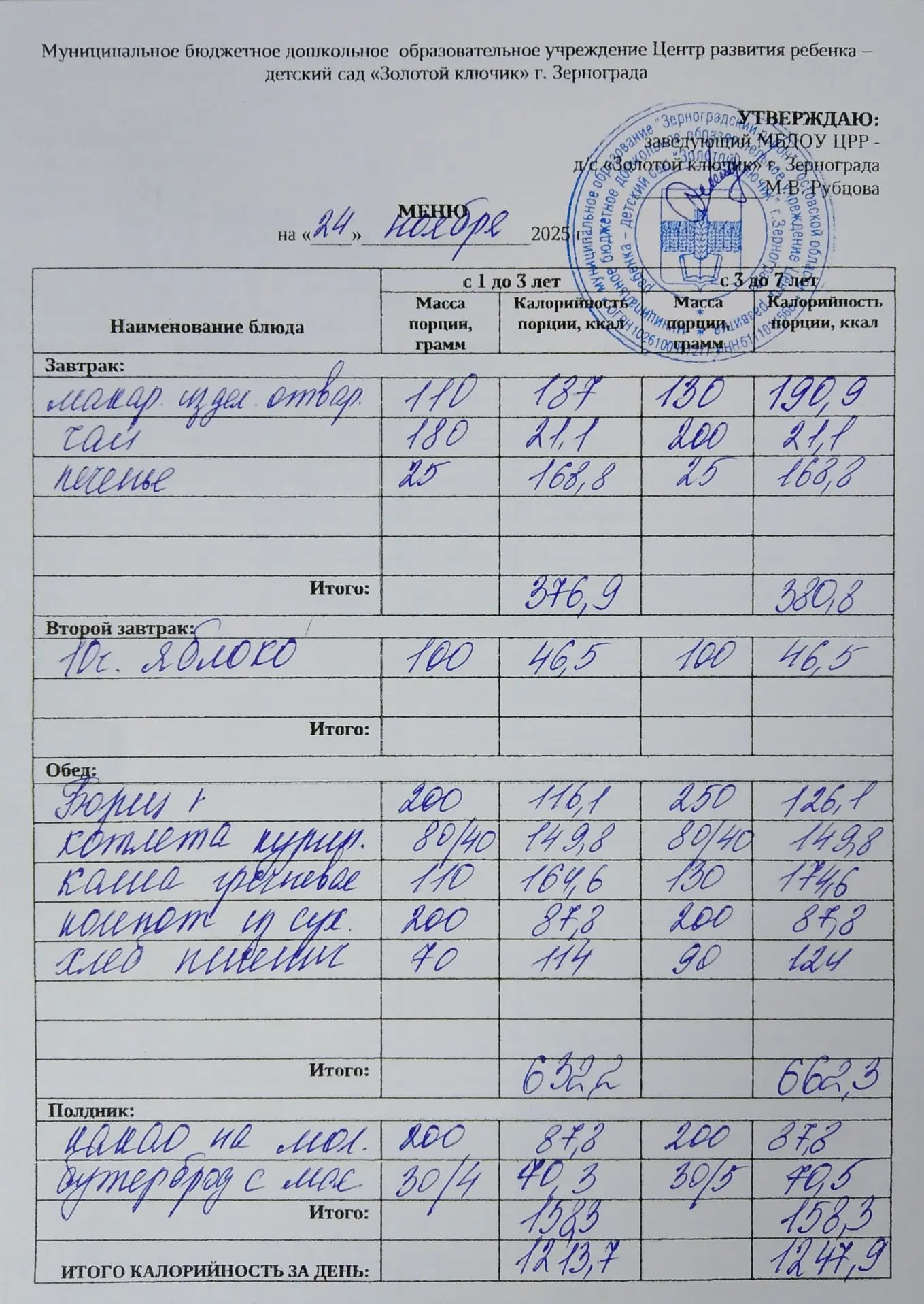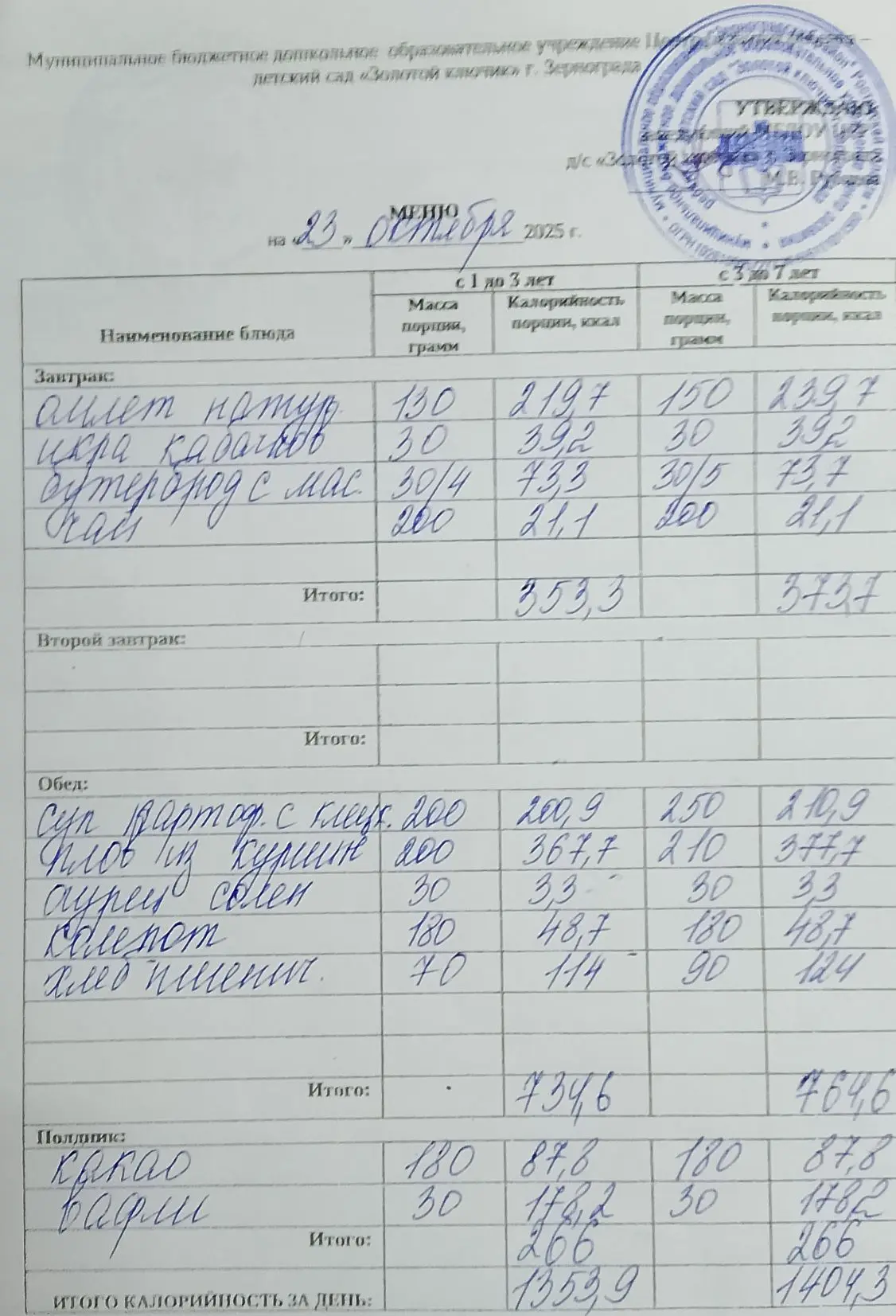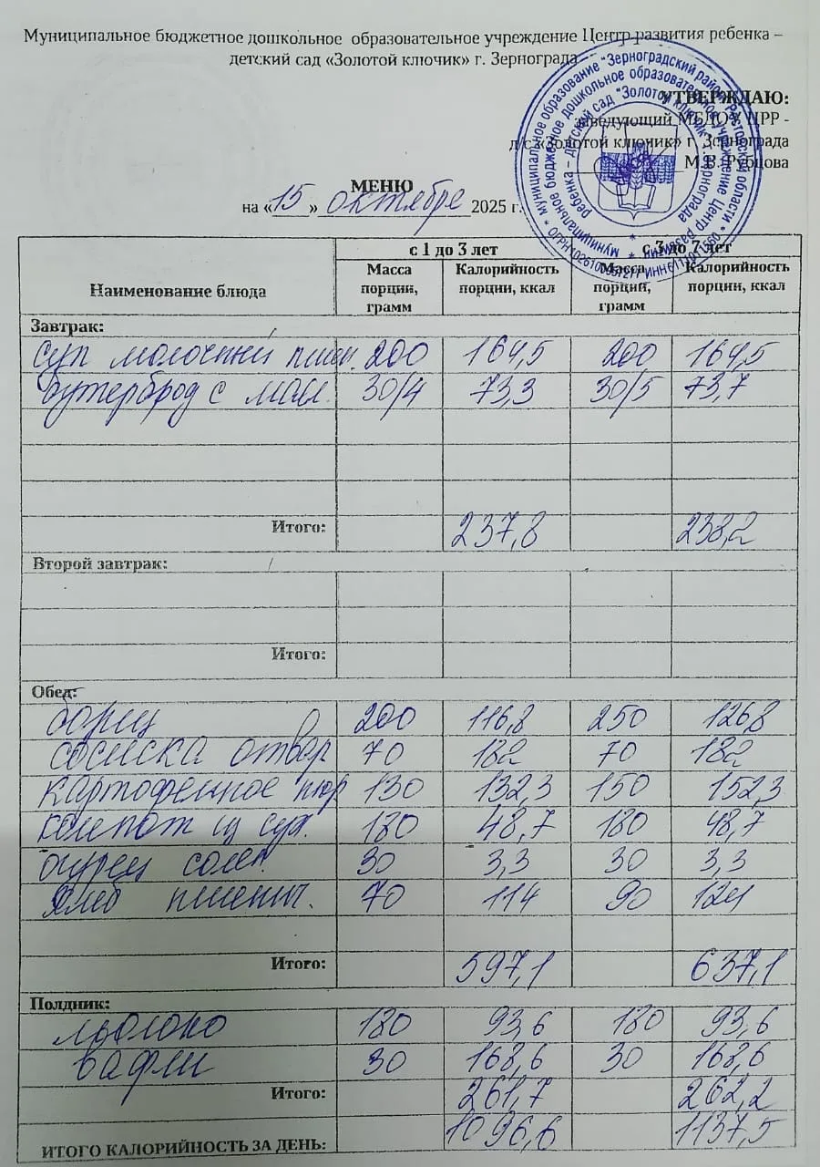 Меню ежедневного горячего питания