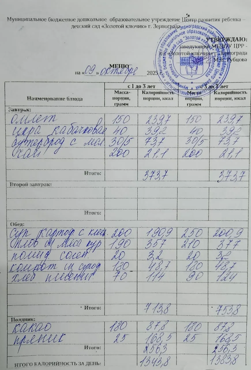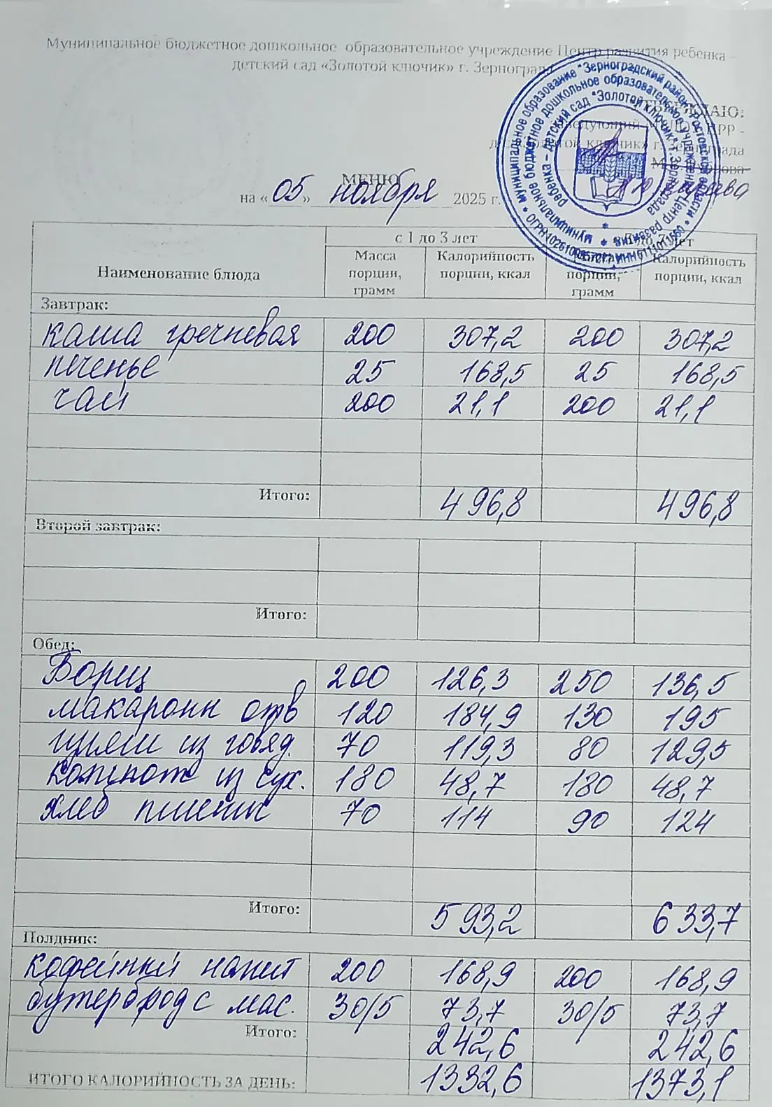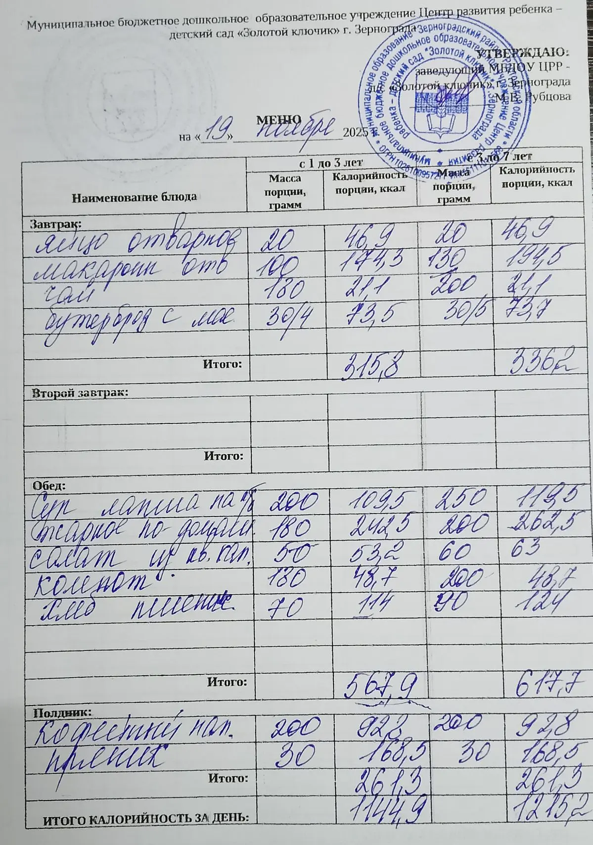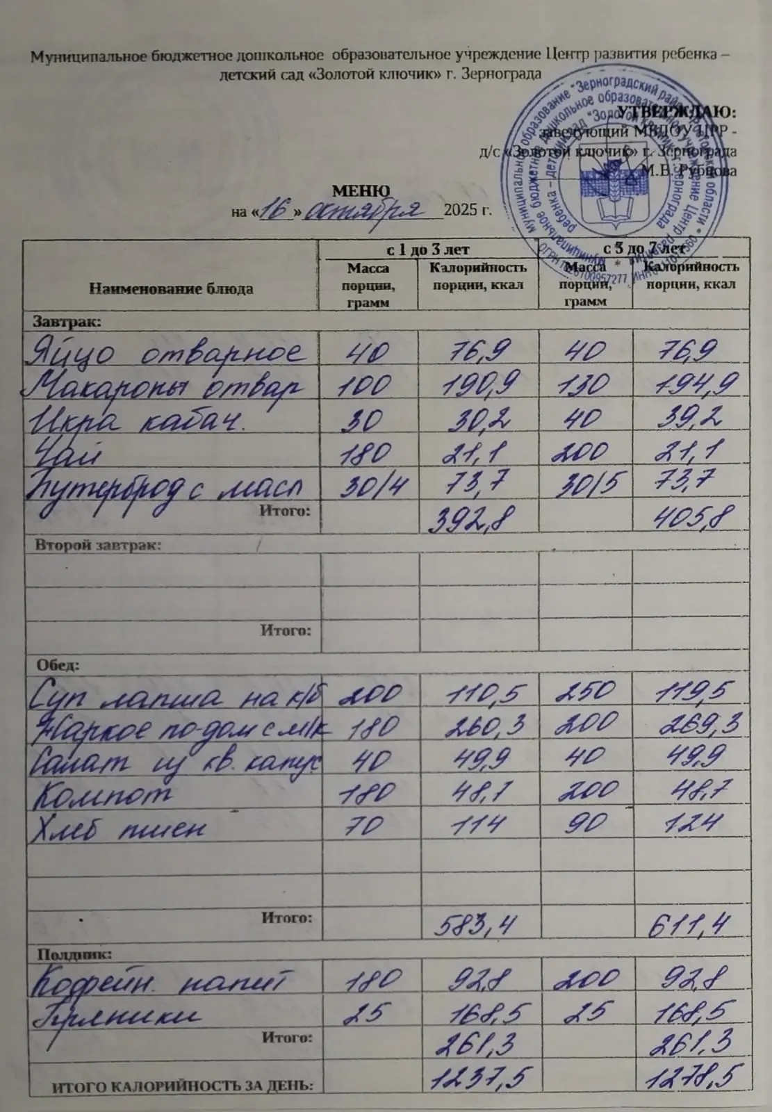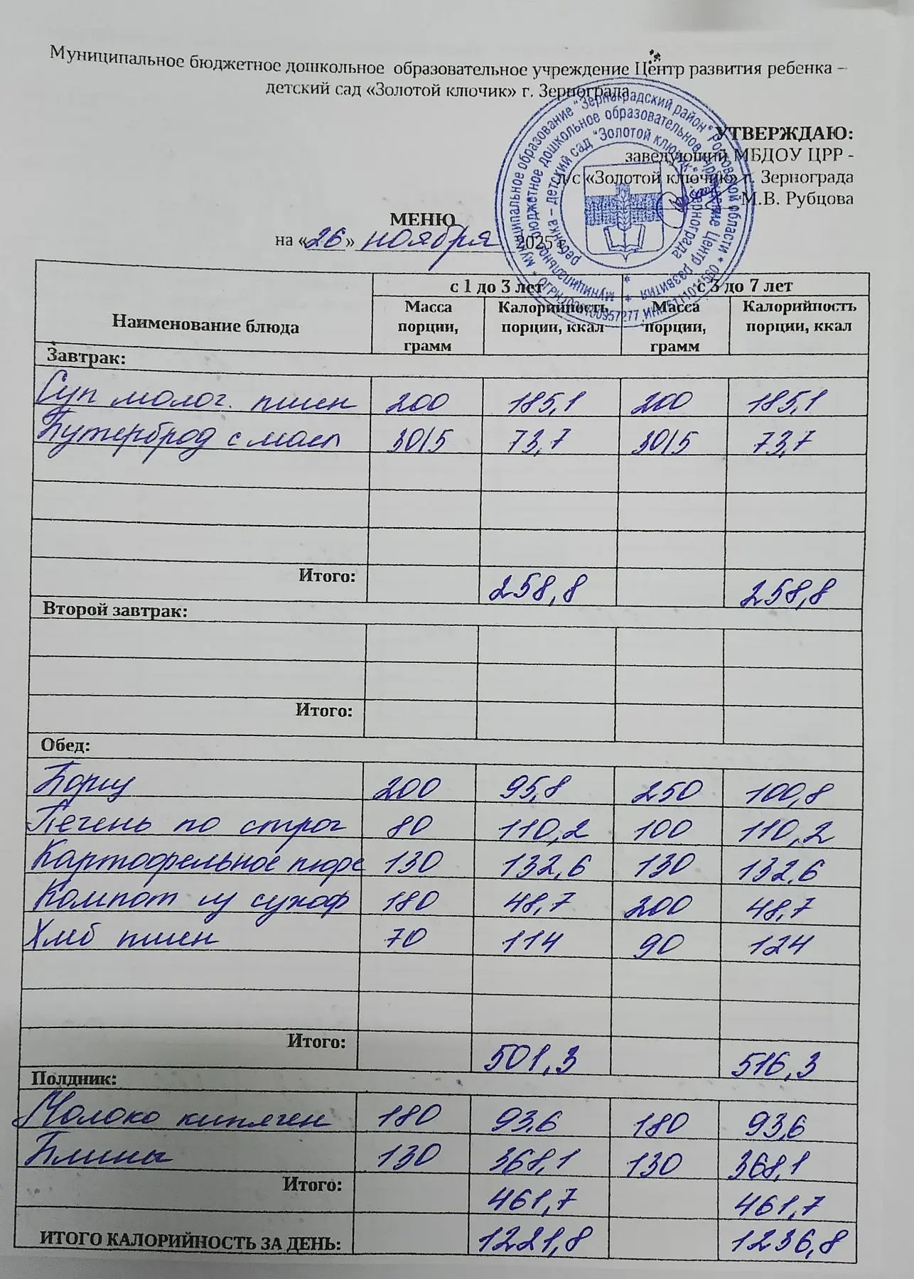 Меню ежедневного горячего питания