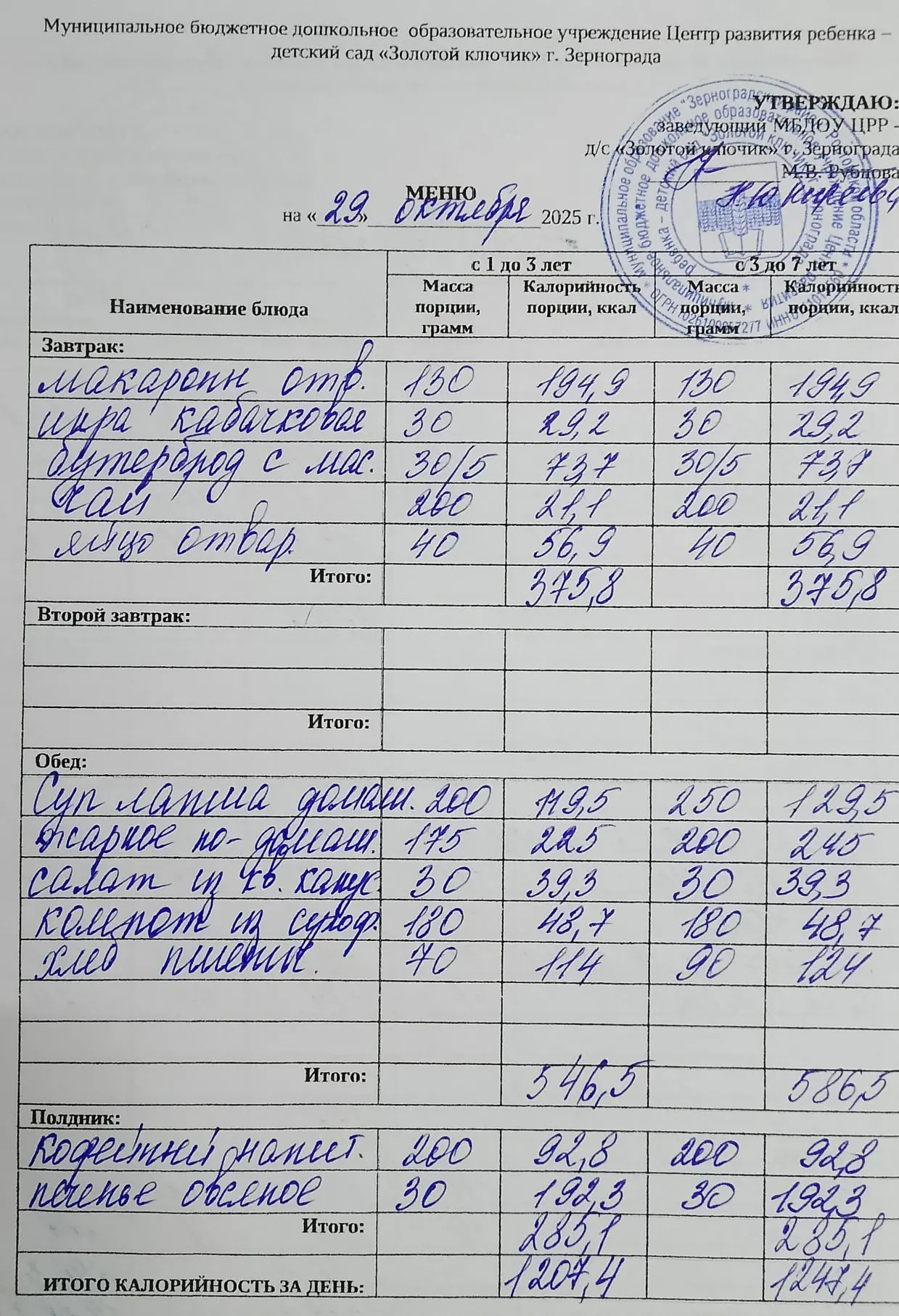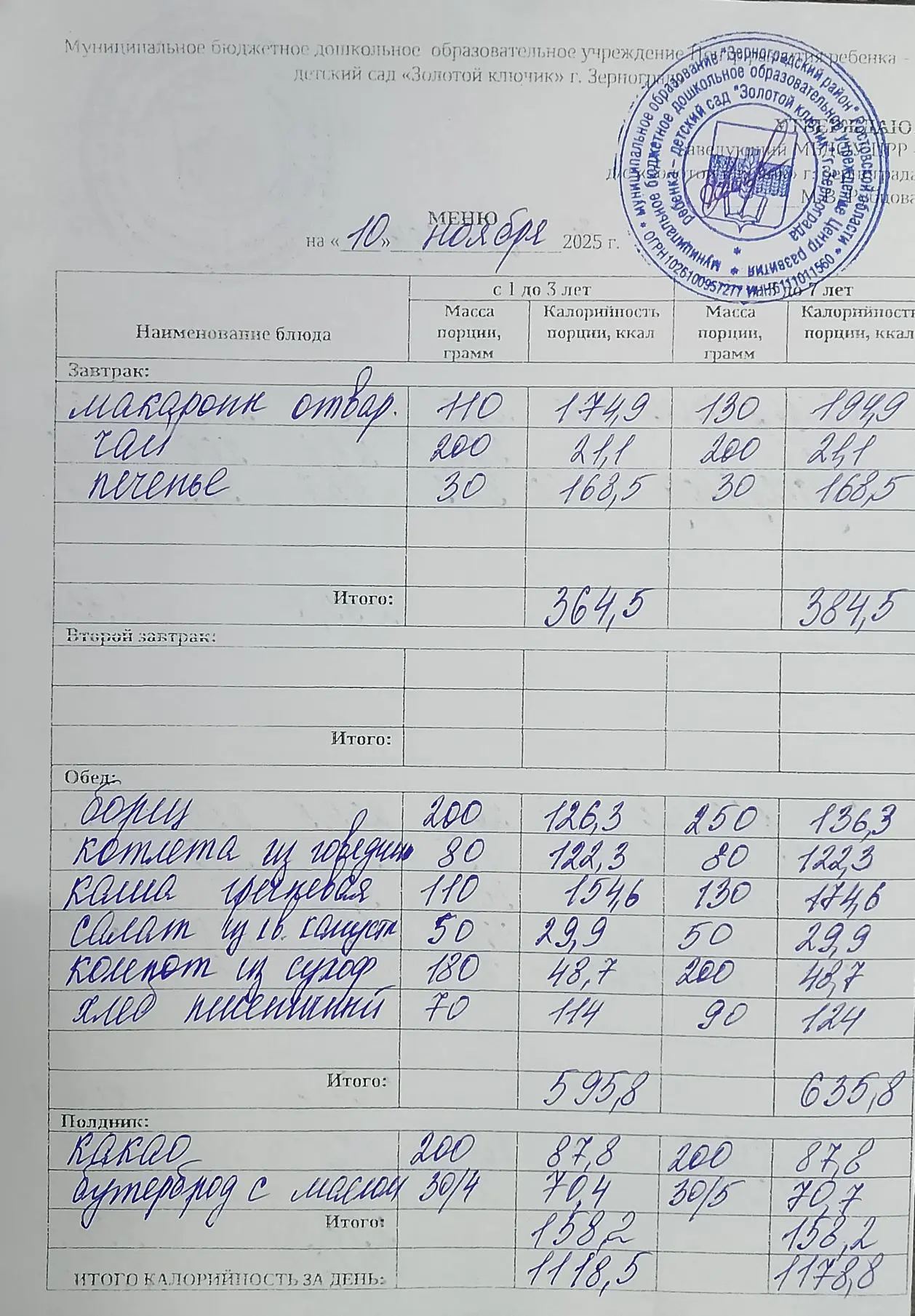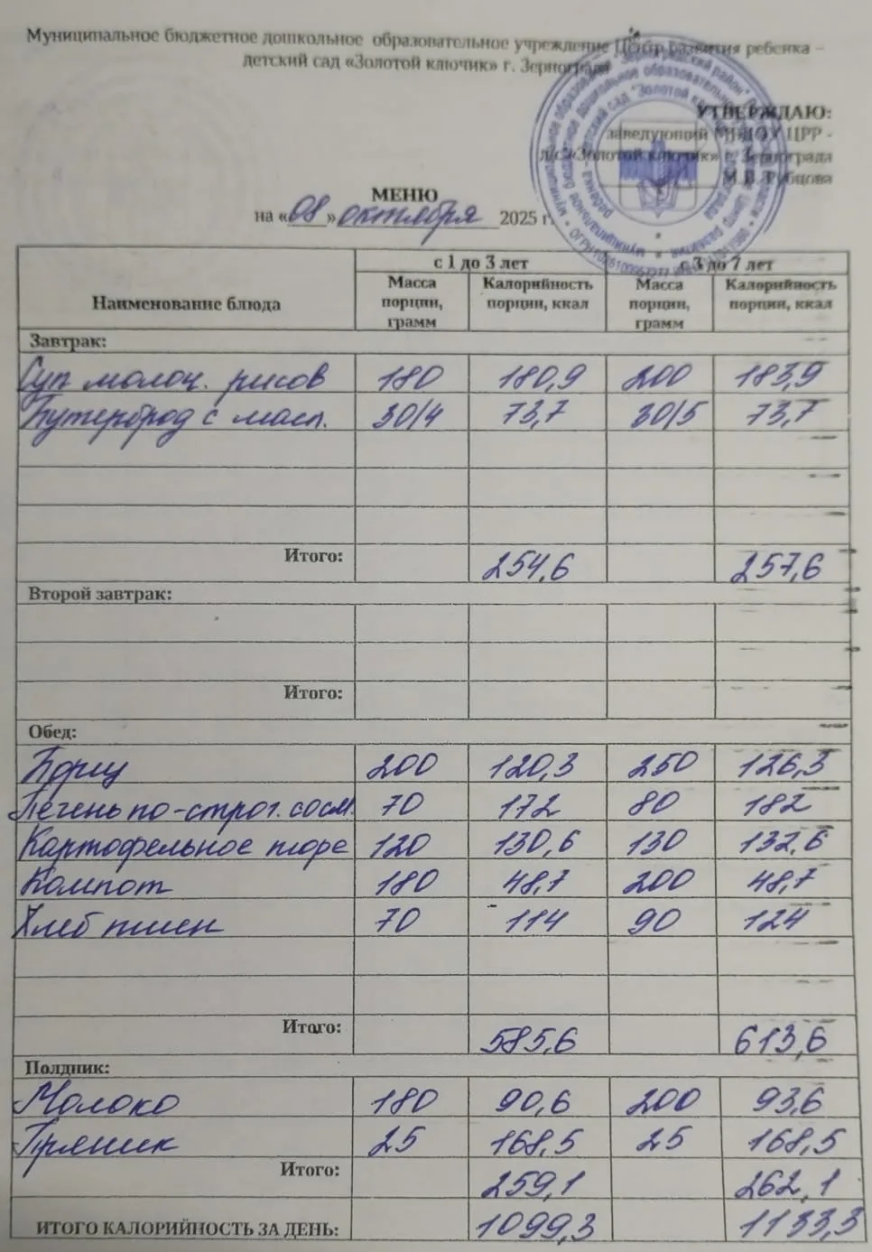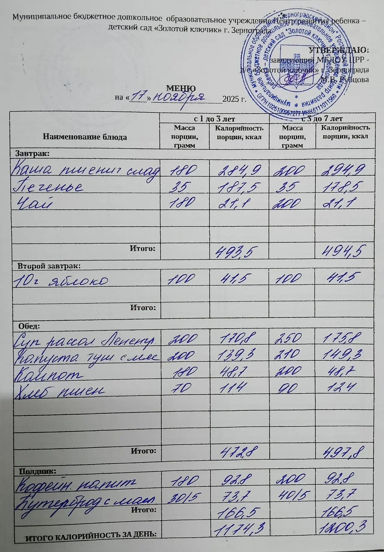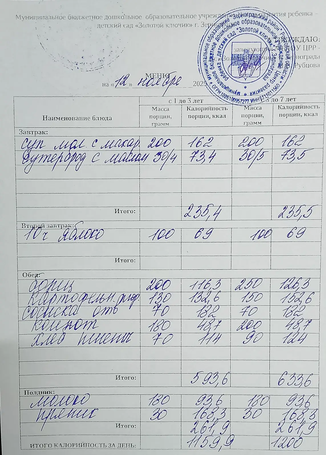 Меню ежедневного горячего питания