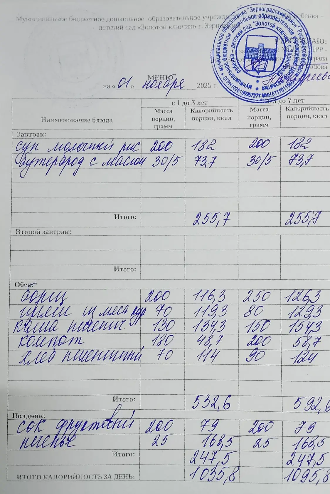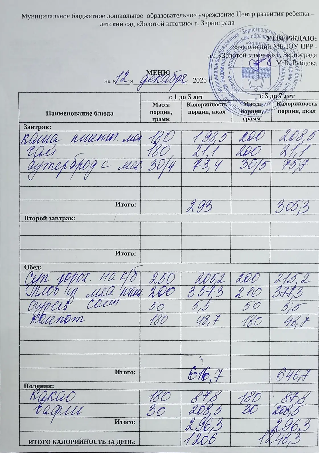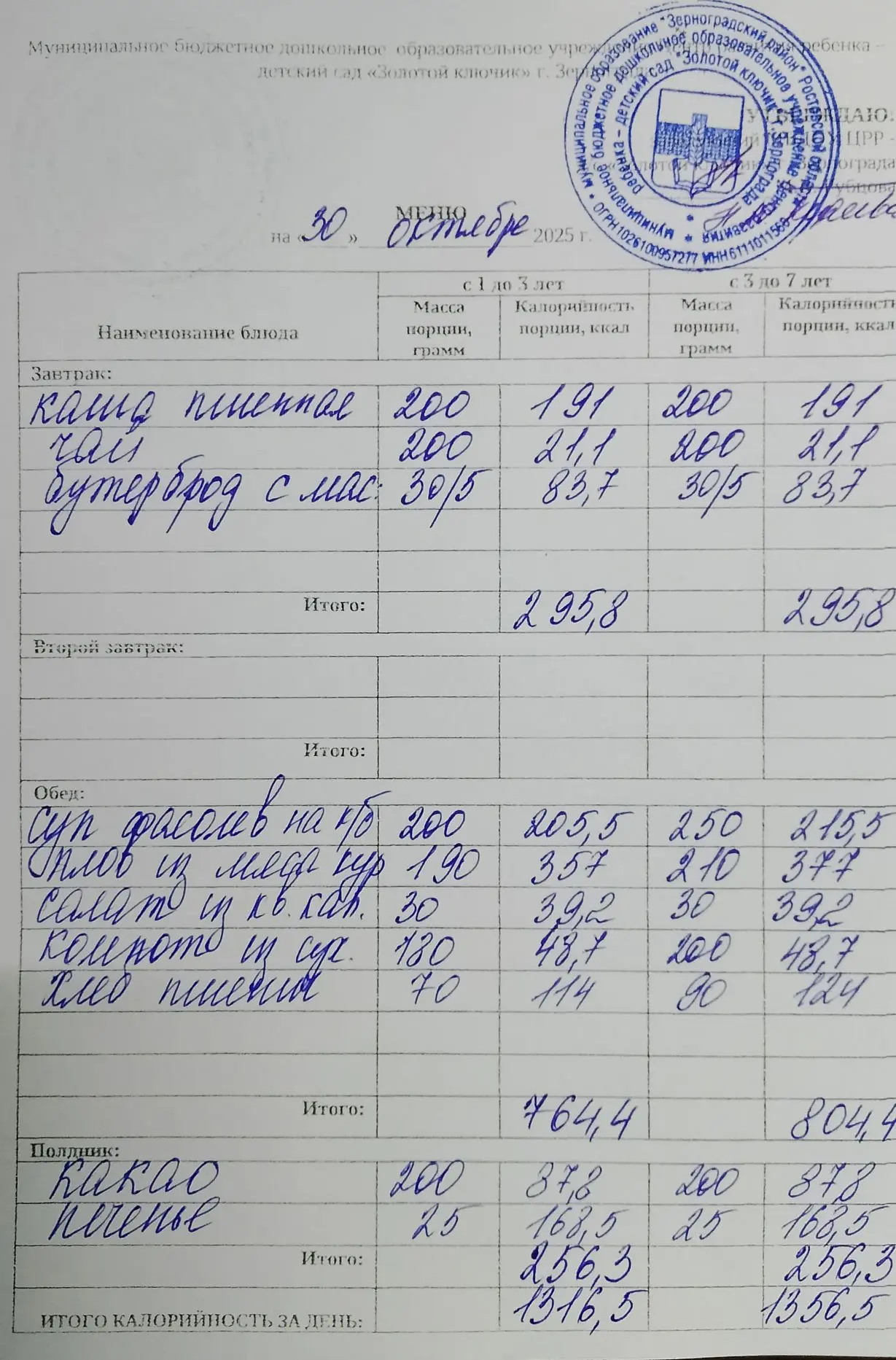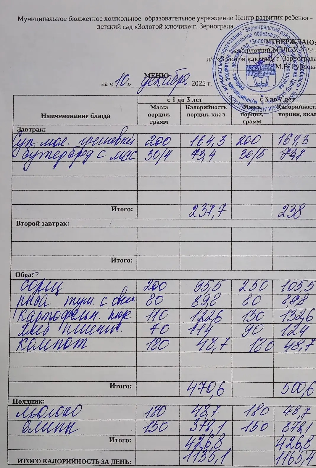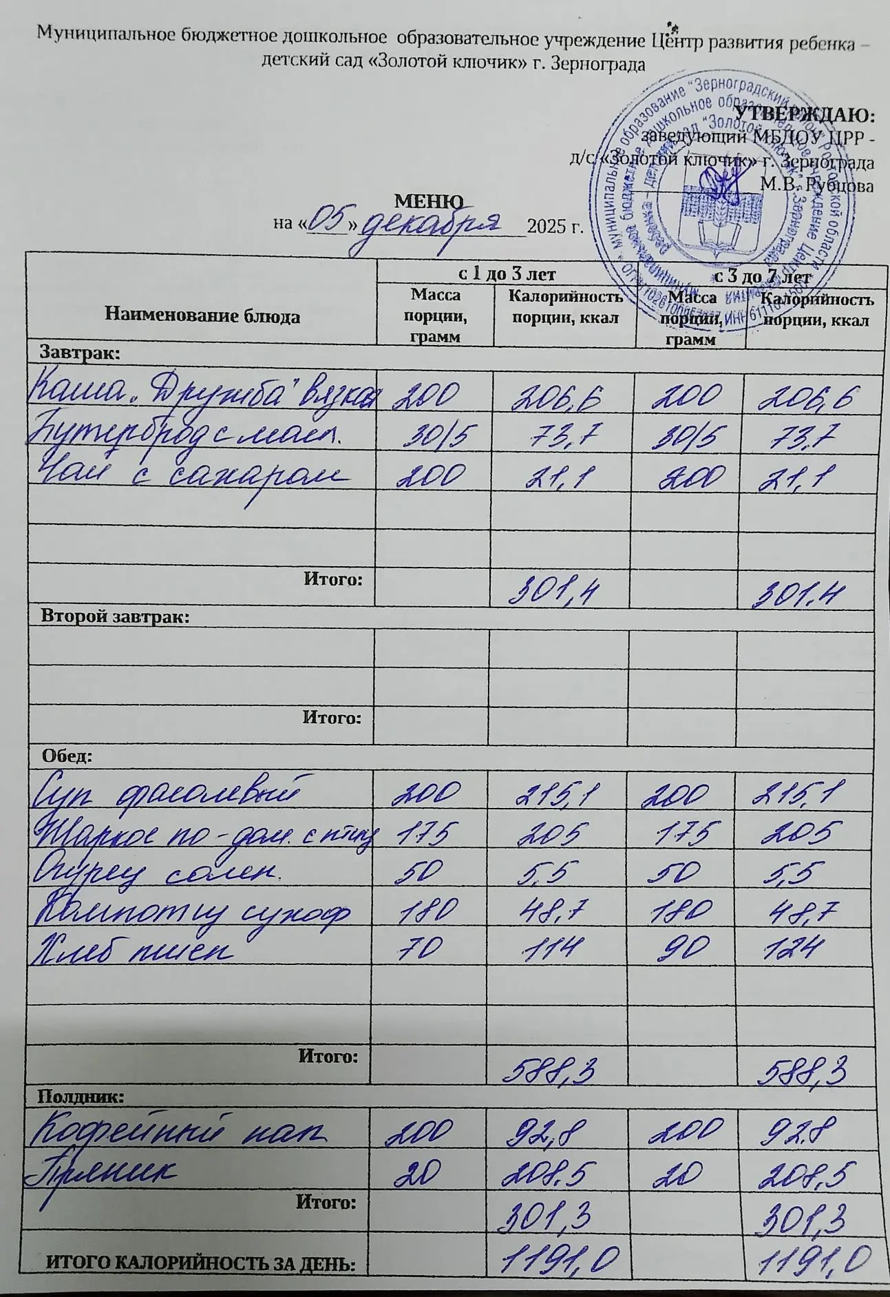 Меню ежедневного горячего питания